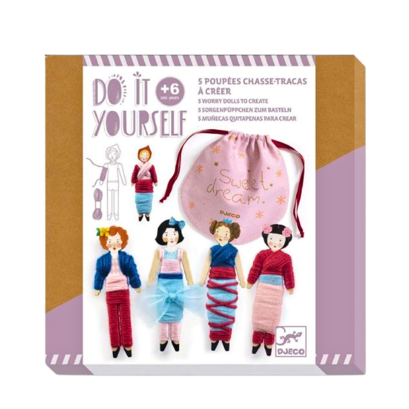 Dress the little dolls by wrapping them in the yarn and coloured tulle provided in the kit. Once the dolls are dressed, children can trust them with their troubles and slip them under their pillow using the pretty pouch provided. Inspired by a Guatemalan tradition, these little dolls chase away minor worries and allow the children to sleep well through the night. • Dolls that make things better.