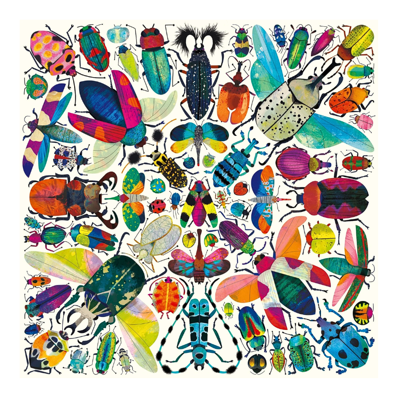 Kaleido-beetles 500 Piece Family Puzzle features a gorgeous illustration of colorful beetles arranged in a pattern inspired by the dazzling view through a kaleidoscope.