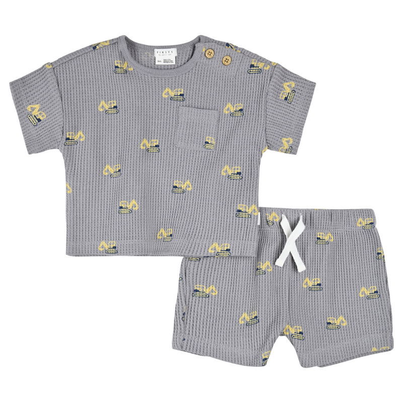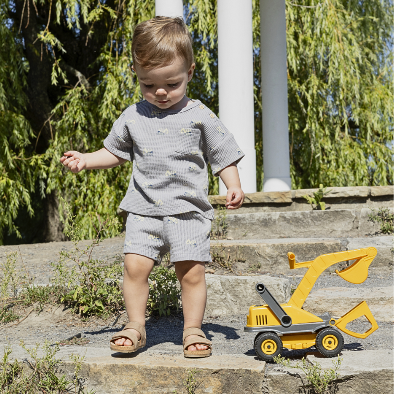 This two-piece set includes a comfy short-sleeved tee and coordinating shorts with a stretchy waistband for easy dressing. Printed with our all-over diggers design, it’s an essential for little busybodies who love to build, dig and discover. Perfect for park days or scooping and exploring in the sandpit.