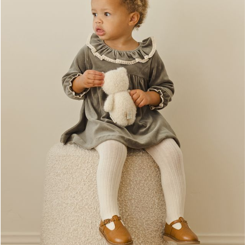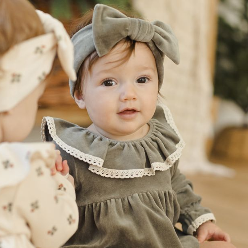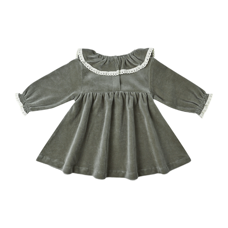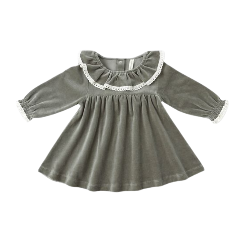 This Velour Baby Dress features an empire waist dress with long sleeves and a cute ruffled collar.