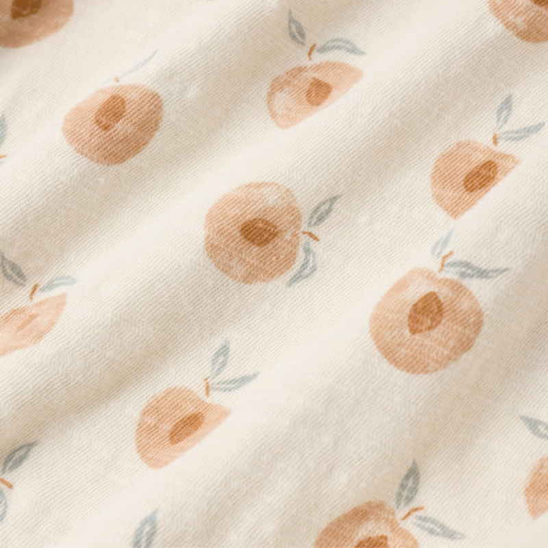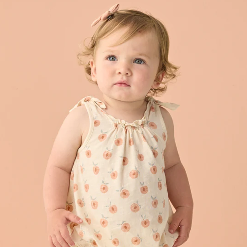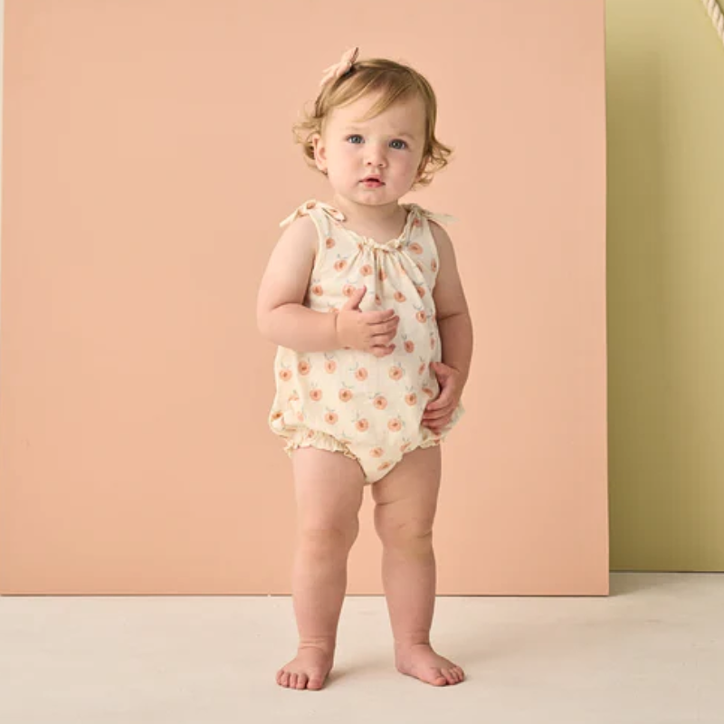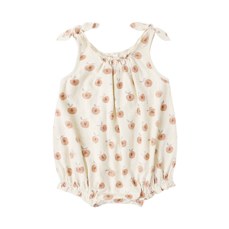 Featuring sweet peach print. Enjoy the fruits of summer in this peachy look.