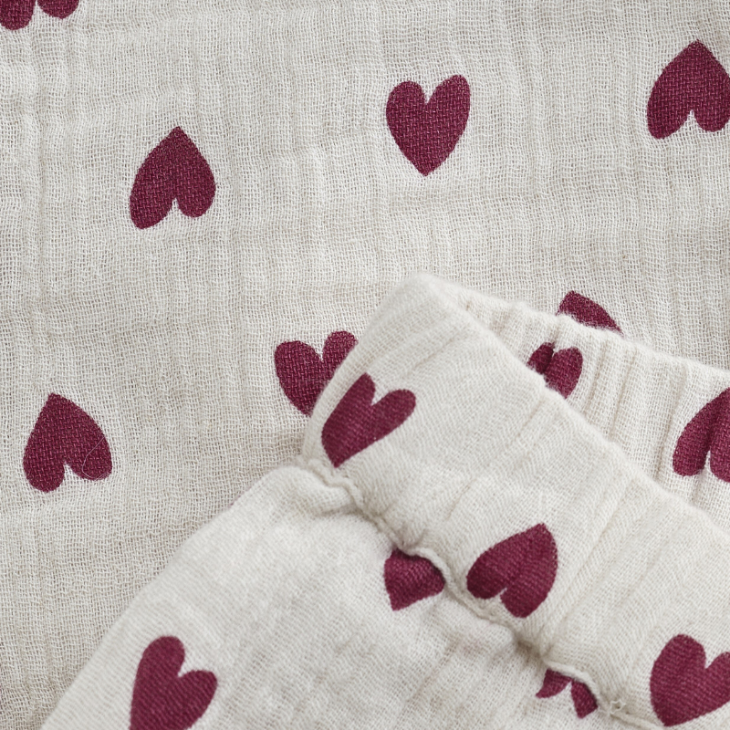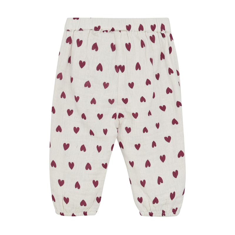 These organic cotton pants are soft and cozy on little skin. The base colour is Eggnog with a Red Heart pattern.