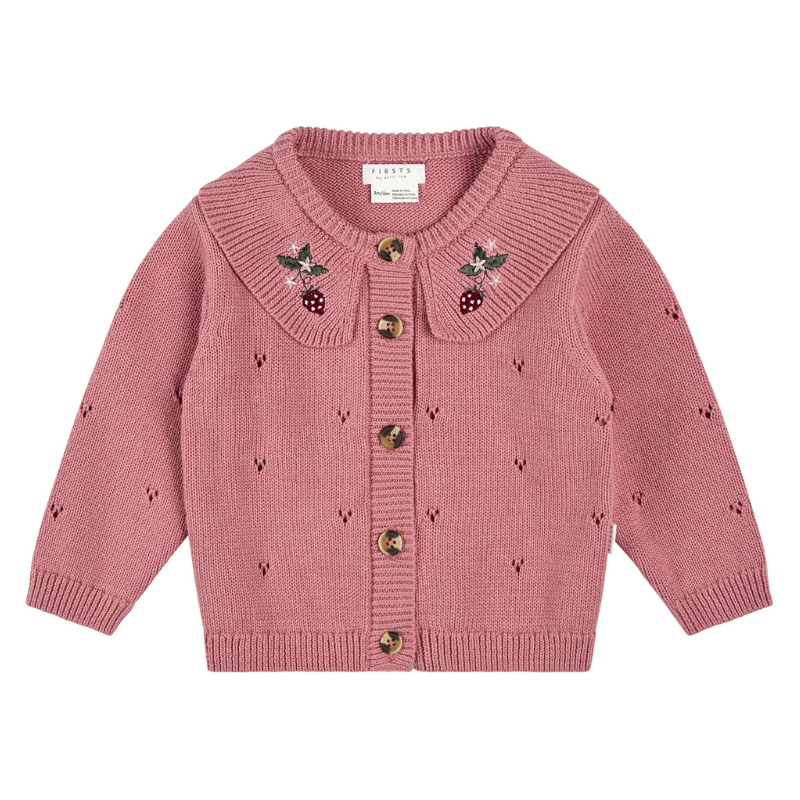 This endearing organic cotton knit cardigan features sweet strawberries.