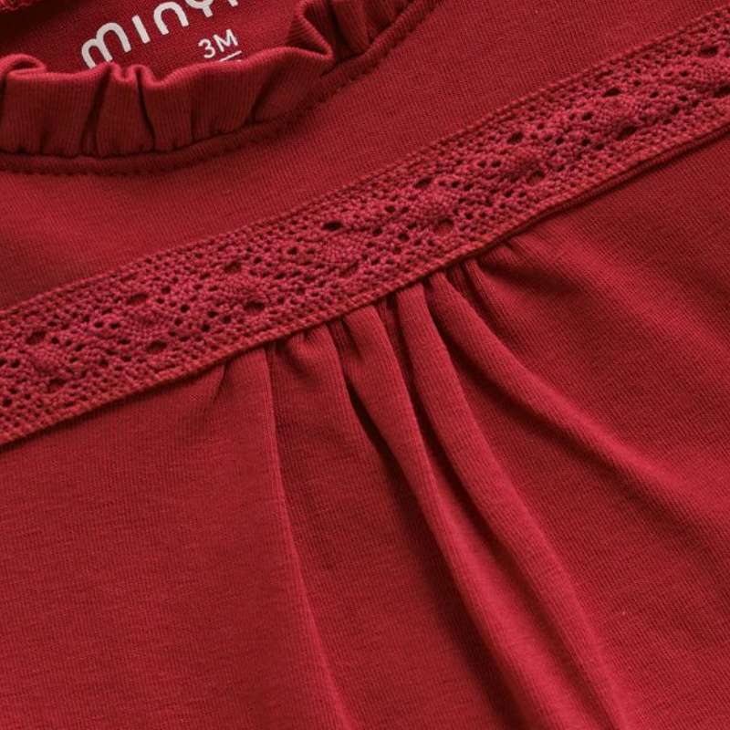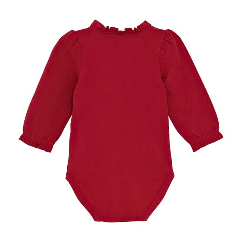This darling little bodysuit is cute for everyday or makes for a great holiday party or photos. This lovely piece features a cotton lace detail, adding a little feminine touch.