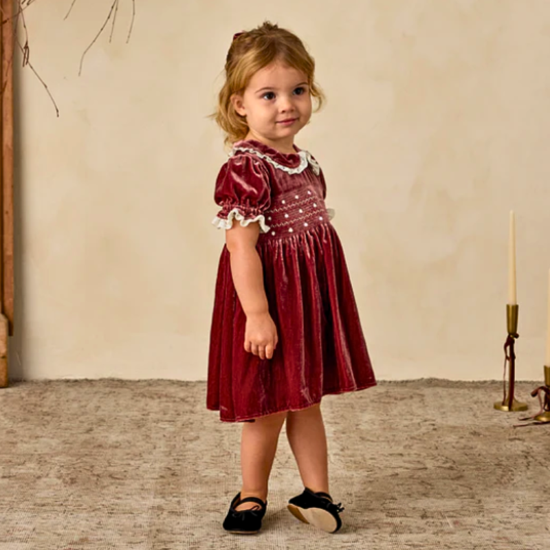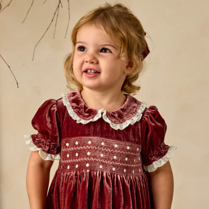 The Elizabeth Dress features a smocked bodice with dainty embroidered details, puff sleeves with lace trim, and a scalloped lace Peter Pan collar. Crafted in soft velvet, this timeless silhouette evokes a sense of tradition and nostalgia, making it the perfect keepsake dress for special occasions and holiday gatherings.