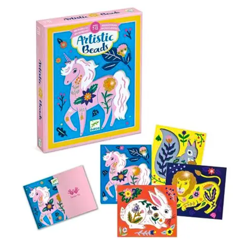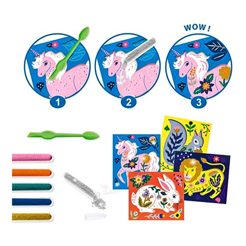 A two step creative process. stick on the glue patch, then apply a decorative beads. Peel back the squares of adhesive foam and pour on the micro beads for a beautiful artistic piece. The numbers associated with the colours guide children in their creations.