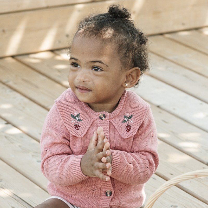 This endearing organic cotton knit cardigan features sweet strawberries.