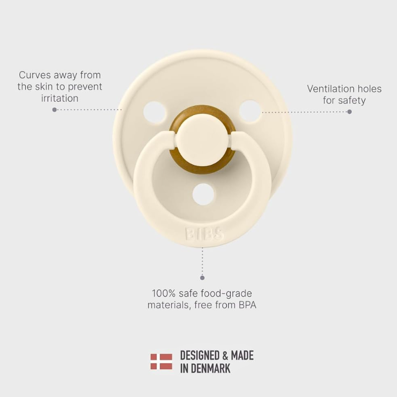 The BIBS pacifier has been a classic for moms and babies for over 30 years. Due to its naturally safe and durable rubber material, the BIBS pacifier has been trusted by moms worldwide for decades. Teach your baby to self-soothe with this pacifier that mimic's mom's breast in both comfort and feet. The BIBS pacifier is 100% free from BPA, PVC, and phthalates. Designed and manufactured in Denmark. Their classic appearance captures a look that's both timeless and elegant.