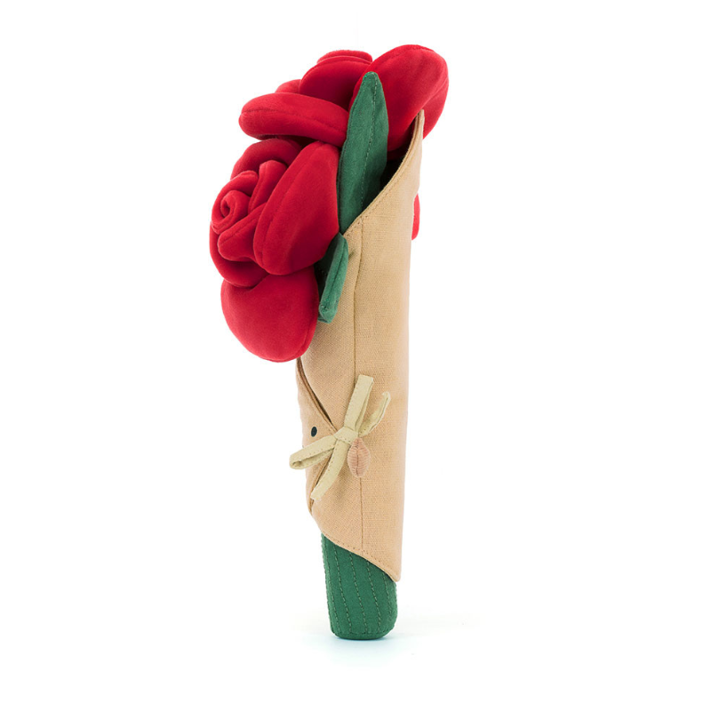 Amuseables Rose Bouquet is the floral gift that keeps on giving. A trio of soft red roses in full bloom with green suedette leaves and stems with stitched detail are wrapped up in beige linen. Tied with a ribbon and wearing an embroidered smile, this wrap has fine cord arms wide for thorn-free cuddles
