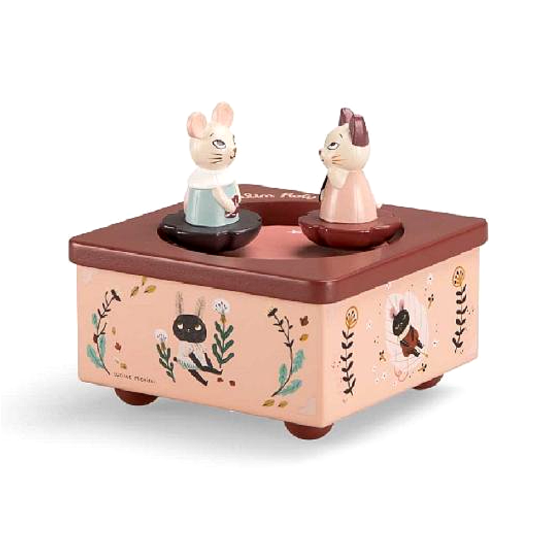 A beautiful addition to any nursery. This compact solid wooden box is decorated with the starry illustrated design with a circular ‘rink’ for the animals to dance on to a delicate tune. Using a hidden magnet mechanism, the characters dance and spin around the rink to the music.