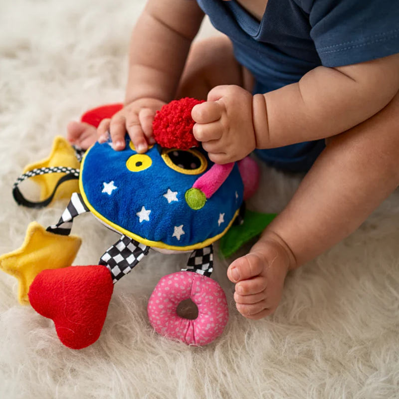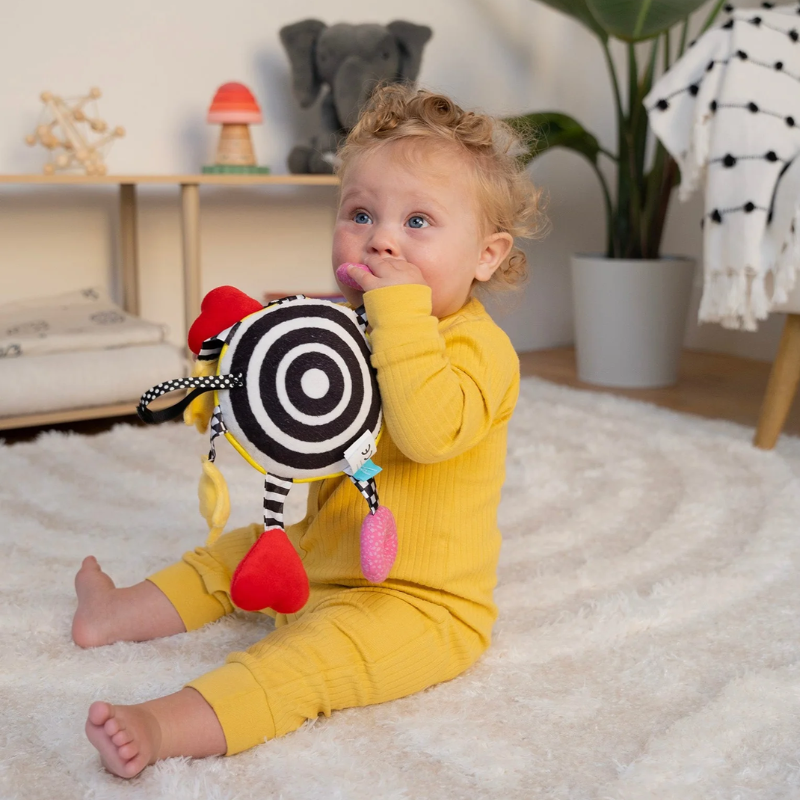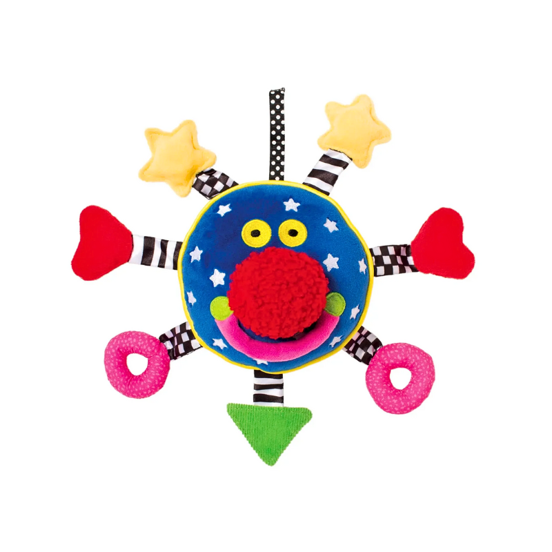 This friendly face is the perfect toy for sensory stimulation! With high-contrast fabrics, a baby-safe mirror, rattles, squeakers, and crinkle paper.