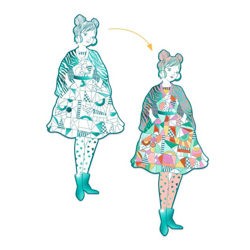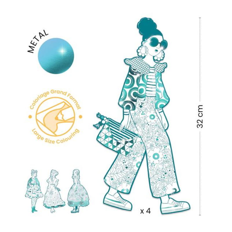 A parade of girls wearing outfits for you to colour in however you fancy! Four large outlines (32 cm high) offer outfits covered in patterns and adorned with shiny metallic areas to make the models look even better!