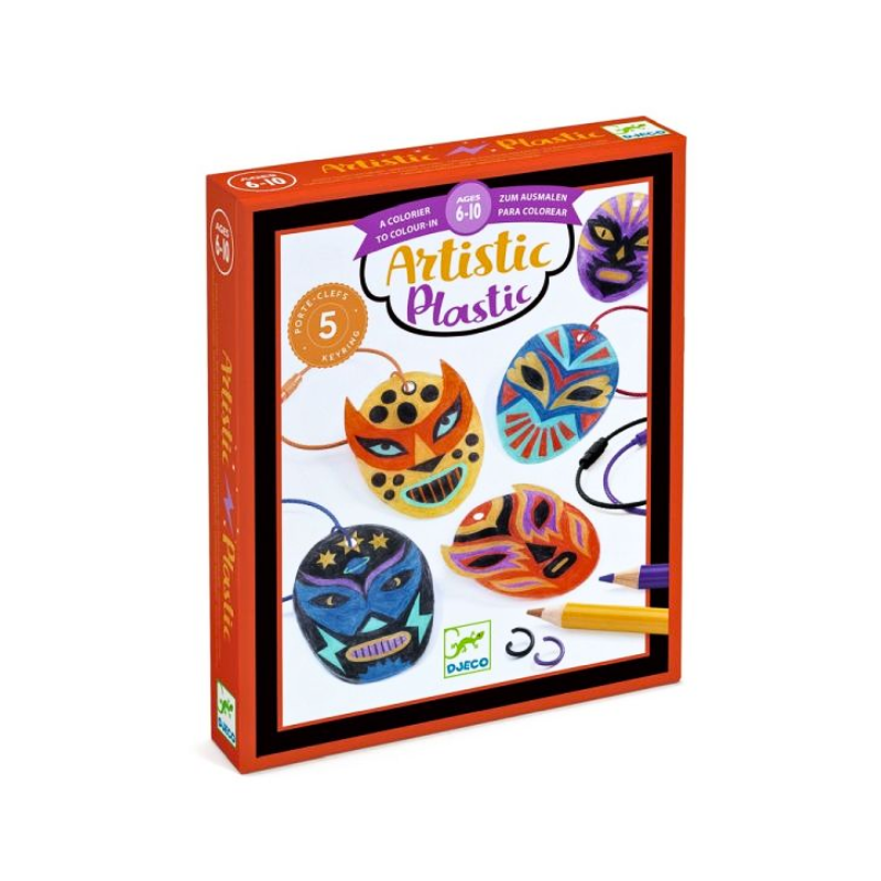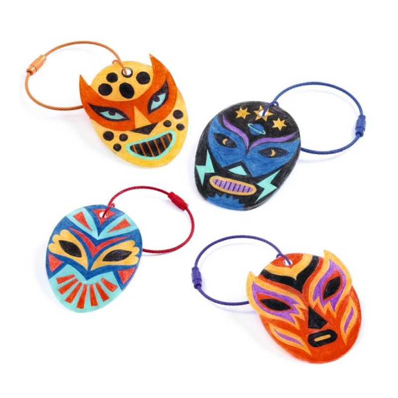 This kit lets kids make five brightly coloured shrink-wrap keychains depicting Mexican wrestlers' masks! To do this, they place the design under the corresponding transparent plastic shape and reproduce the design with the coloured pencils. Once they go into the oven, the magic happens: the figures shrink in just a few seconds, and the plastic becomes hard and thick. All you have to do is hang the creations on the coloured rings to create beautiful key rings.