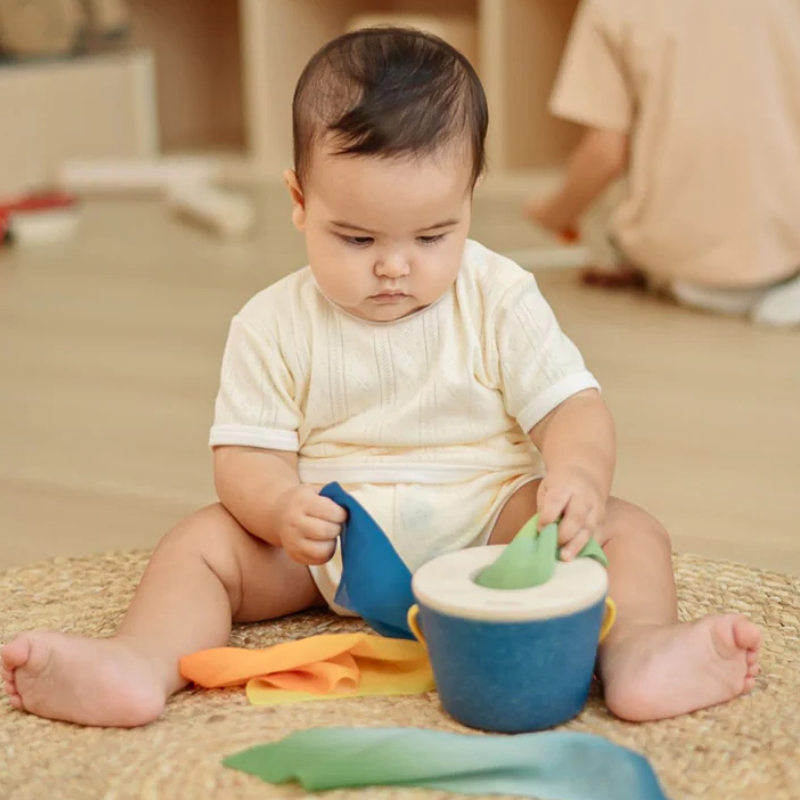- Supports fine motor control and purposeful movement as babies pull cloths from the opening.
