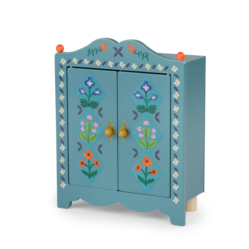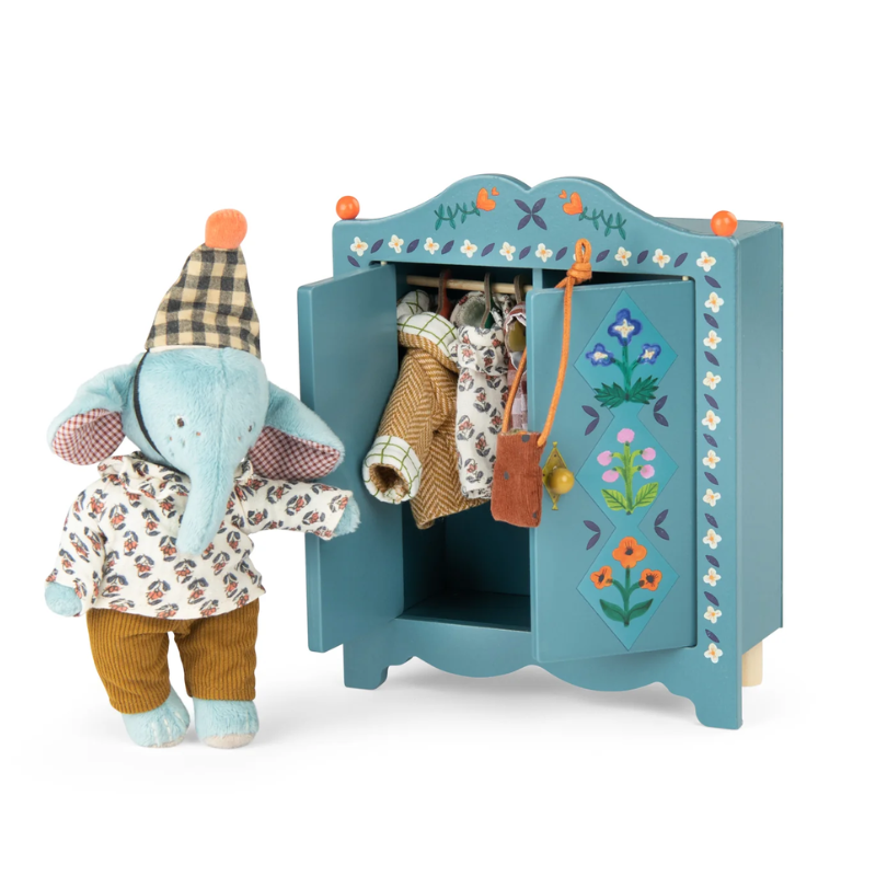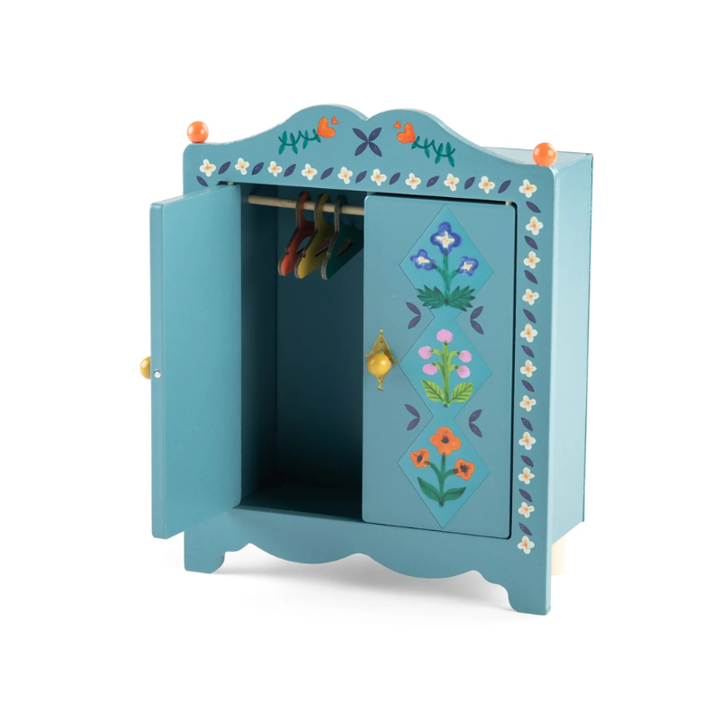 Pablo’s woolly hat is hiding somewhere — or maybe right on his head! This charming wooden wardrobe features a magnetic closure and three little hangers, perfect for storing tiny clothes and accessories. (Animals & clothing sold separately.)