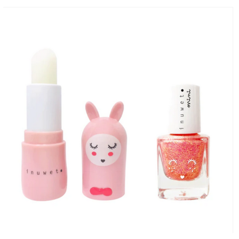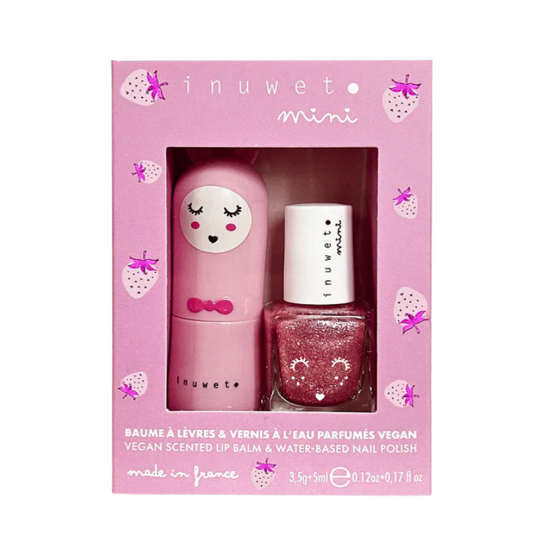 This set includes a a delicious Strawberry lip balm and a pink water-based nail polish that smells of freshly picked strawberry.