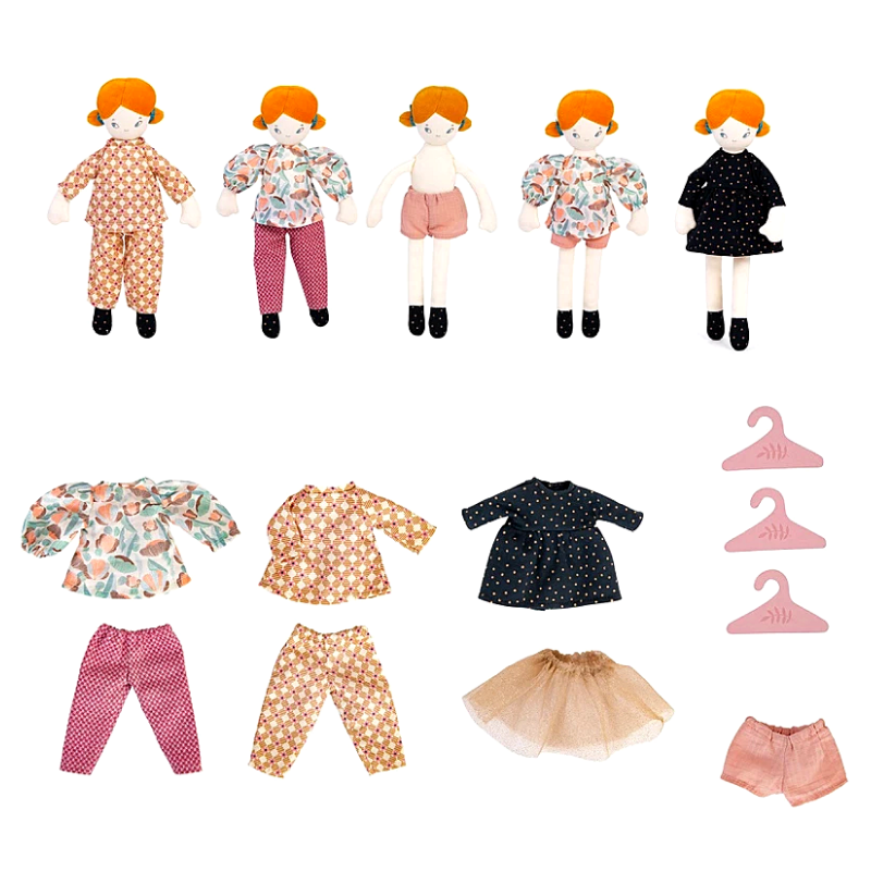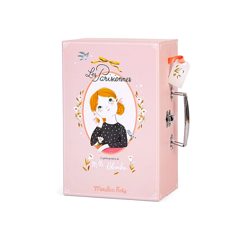 Mademoiselle Blanche is inviting us into her wardrobe! A suitcase wardrobe with a built-in mirror, wooden rail, patterned hangers and 3 outfits tucked in a drawer. Is she getting ready for a night out or a pajama party? It’s up to you to choose her outfit!