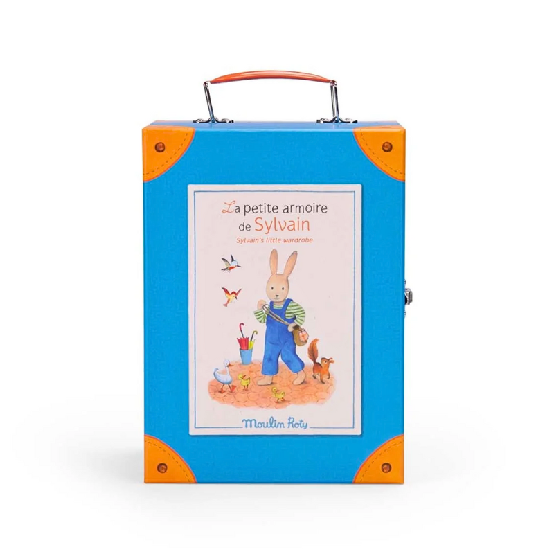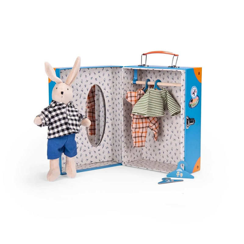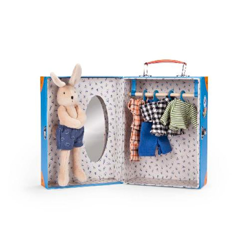 Sylvain invites us into his dressing room! A wardrobe suitcase with integrated mirror, wooden closet and illustrated hangers, in which clothes are stored. Whether it's a raincoat, a dress or a pair of pants, the choice is yours!