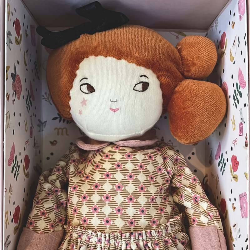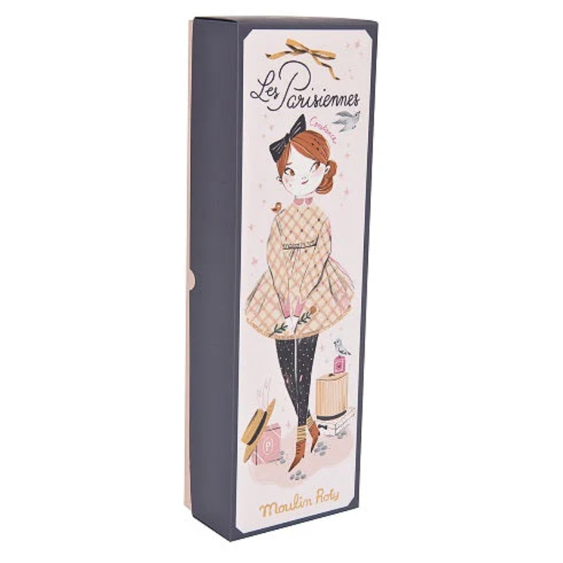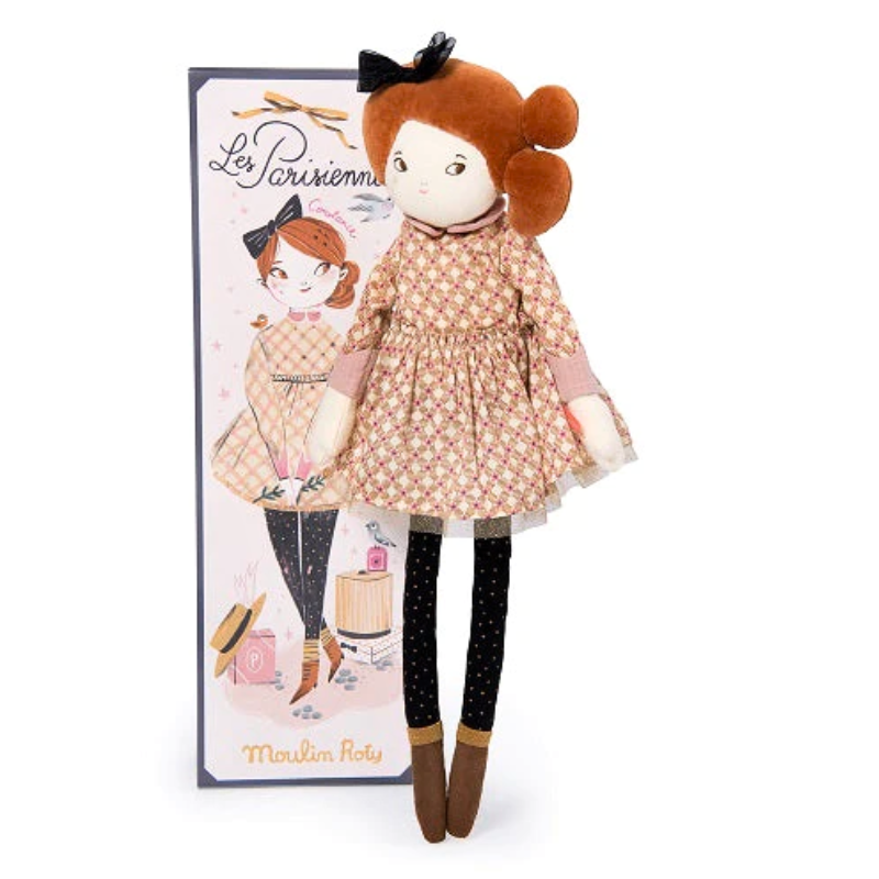 Madame Constance doll! Ravishing in her floral dress, Claudine collar, sequined flounce and chiffon bow, the ultimate Parisiennes? she comes in a gift box, illustrated by designer Lucille Michieli.
