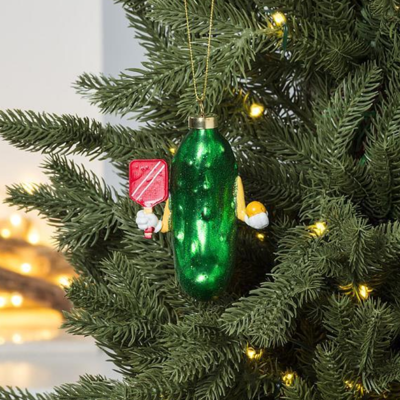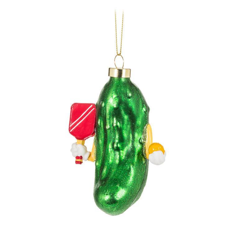 Any pickleball player will appreciate the play-on-words of this delightful Pickle Pickleball Ornament. Crafted out of glass, this shiny ornament features a bright-green pickle carrying a pickleball racquet in one hand, and a ball in the other for a playful complement to any pickleball lover's Christmas tree. — a playful addition to any Christmas tree.