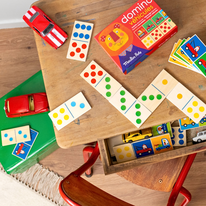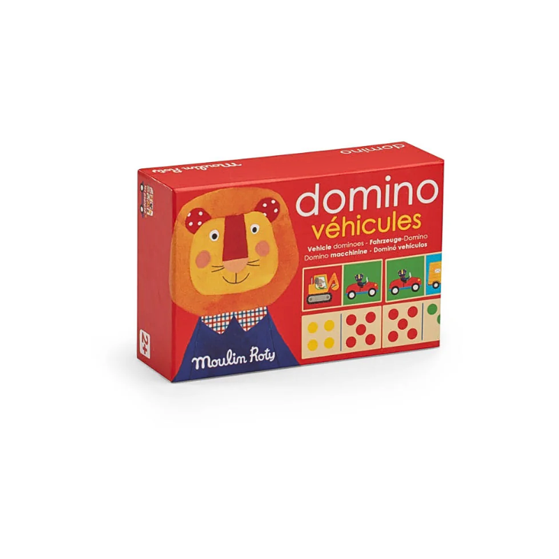 Each player starts with 5 of the 28 wooden dominoes. Choose which side you'll play with: vehicles or numbers. Lay them down, connecting them by matching sides. The player with the most dominoes wins!