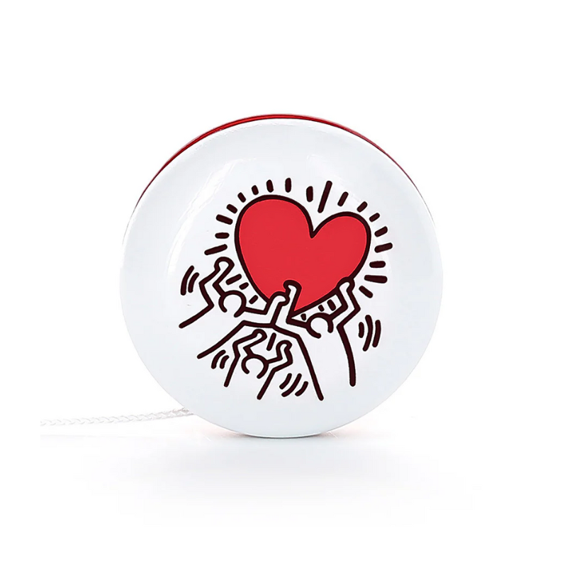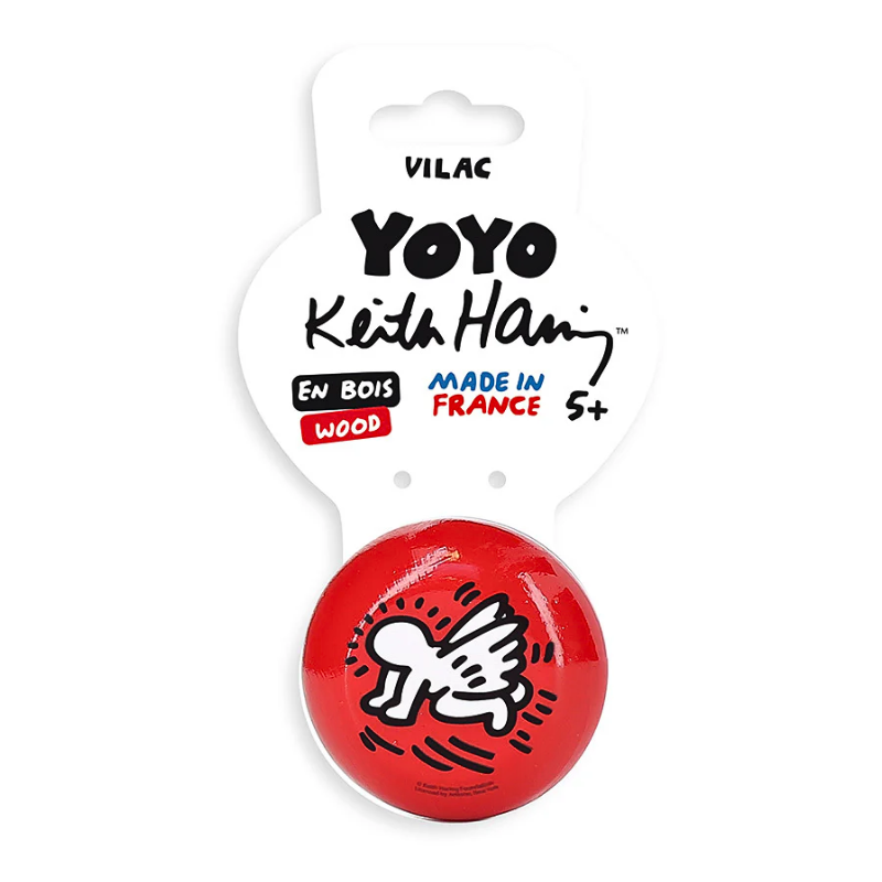 Featuring 2 iconic drawings by Keith Haring, this solid lacquered wood yo-yo made in France is a collector's item to offer! Vilac was one of the first companies to collaborate with the American artist Keith Haring, one of the pioneers of Pop Art and Street Art, when his art was not as famous as it is today. His iconography is a permanent narrative of babies, angels, flying saucers, televisions, etc. repeated over and over again with his signature black outlines.