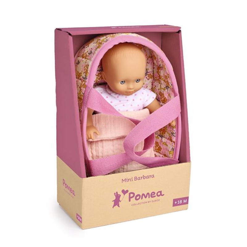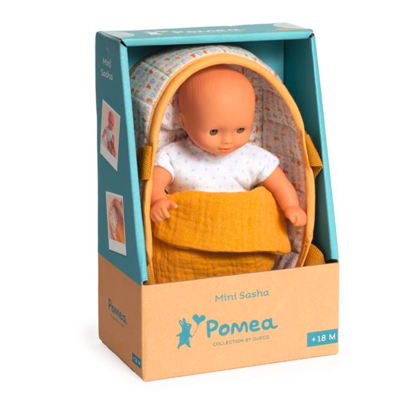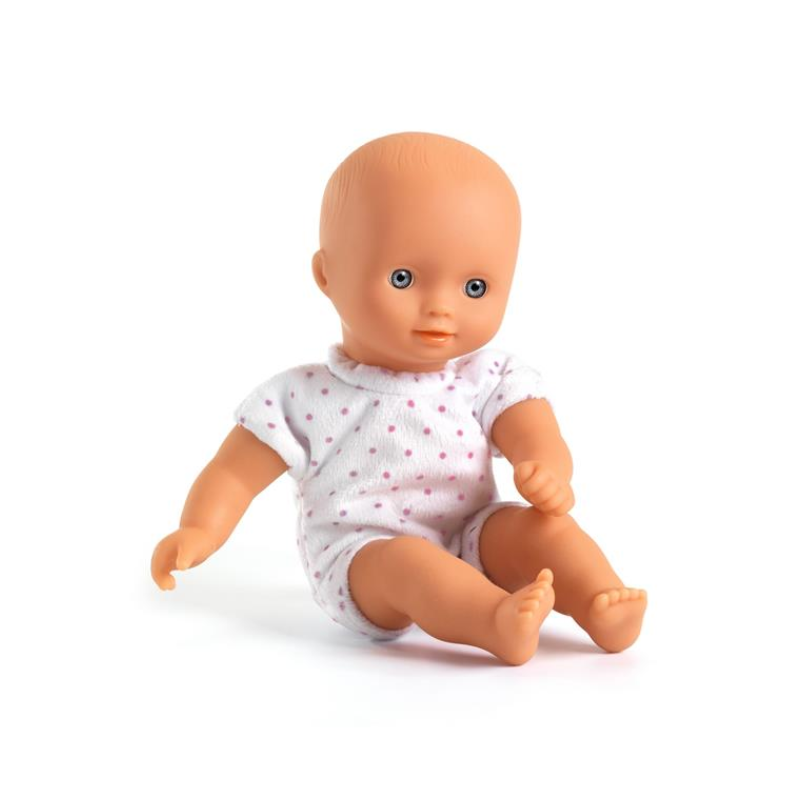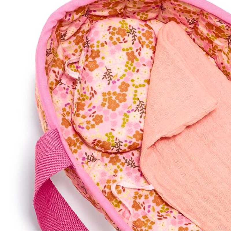 These a charming 20 cm doll with laughing eyes. Her soft and flexible body is printed with pyjamas. Nestled in an adorable quilted Moses basket with an elegant design, she will quickly become the ideal companion for little ones to cuddle and treasure wherever they decide to take them.