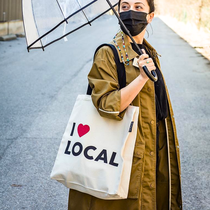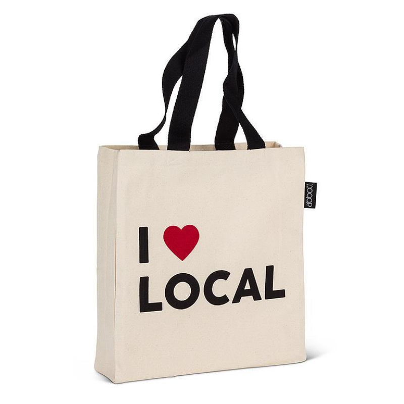 Support your love for local businesses and the environment at the same time with this "I Heart Local" Tote Bag. This large cotton tote with sturdy black handles is accented with bold graphic type and a heart icon – perfect for carrying everything from groceries to books and more.