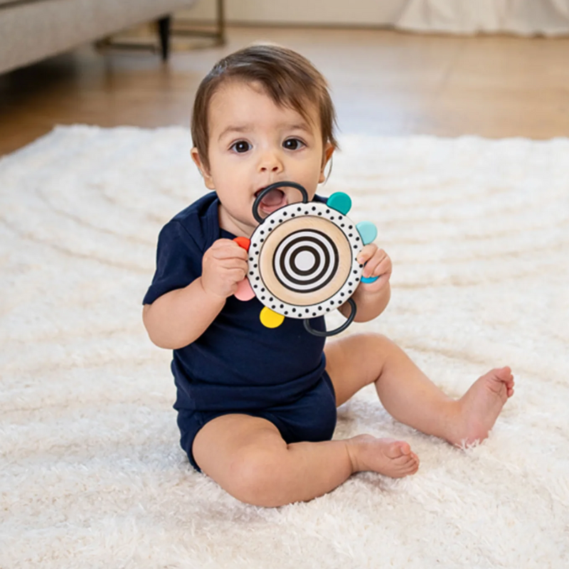 - High-contrast bullseye graphic for honing focus and supporting infant visual development