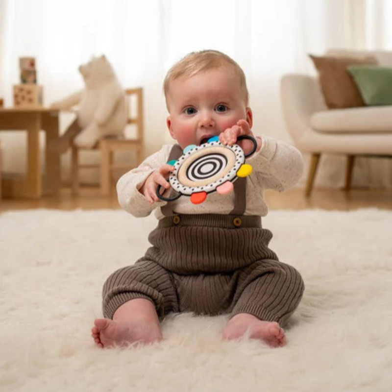 Grasping, self-discovery, and teething toy. The visually engaging Grasp & See Mirror features a round baby-safe mirror, surrounded by a natural wood ring with sturdy plastic handles, colorful soft plastic teething nubs, and a bullseye graphic center.
