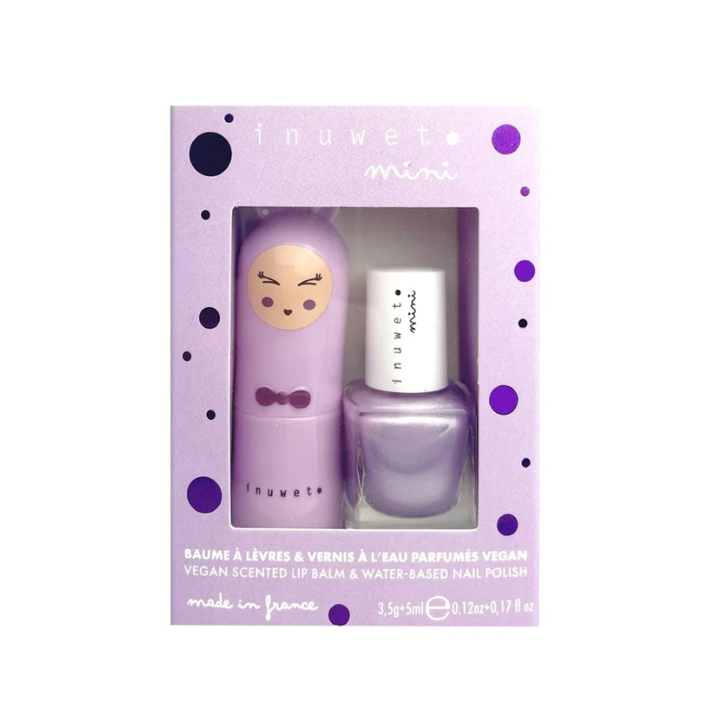 This set includes a a delicious marshmallow lip balm and a purple water-based nail polish that smells of freshly picked blueberries.